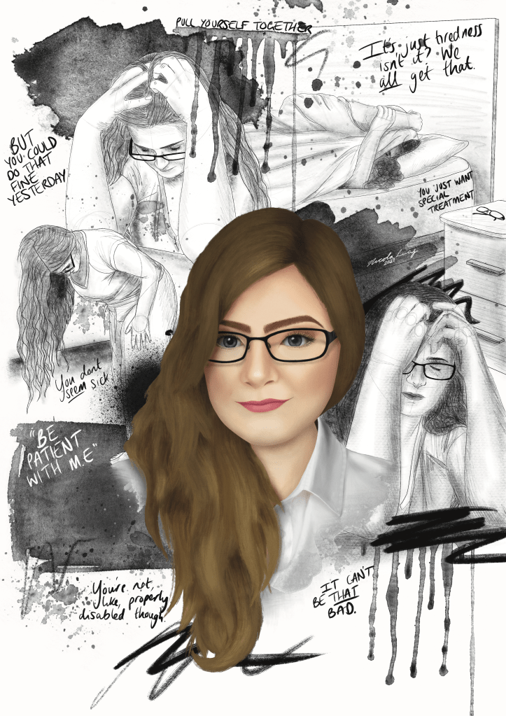 The concept behind the art style is that whilst I may present a relatively well put together version of myself to mask my illness, most people have never seen me when I struggle the most as I can’t leave my room. The best version of myself is presented as a finished piece, which is the version that is displayed publicly, whereas me struggling is presented as rough sketches – something usually kept hidden away in a sketchbook.